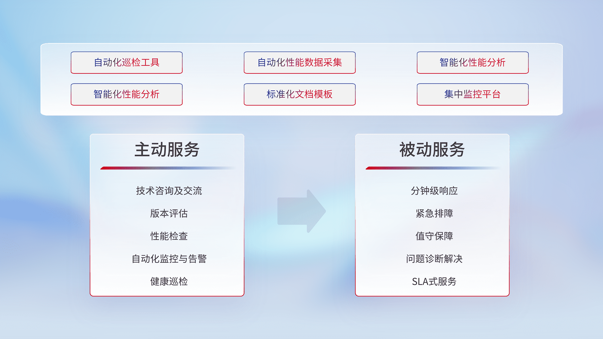 智能化工具和标准化文档,,保障服务质量,,,,提供主动服务(包含技术咨询、、版本评估、、性能检查、、、自动化监控与告警、、、、健康巡检)和被动服务包含(分钟级响应、、紧急排障、、、值守保障、、、、问题诊断解决、、、SLA服务)。。。